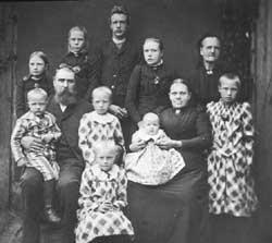 Sigurd Hoel sammen med seks av sine åtte søsken, fotografert i anledning 75-års dagen til broren Olav i 1953. Fra venstre Magnhild, Signy, Gudrun, Olav, Sigurd, Aasta og Dagny. (Foto utlånt av Liv Heier)
